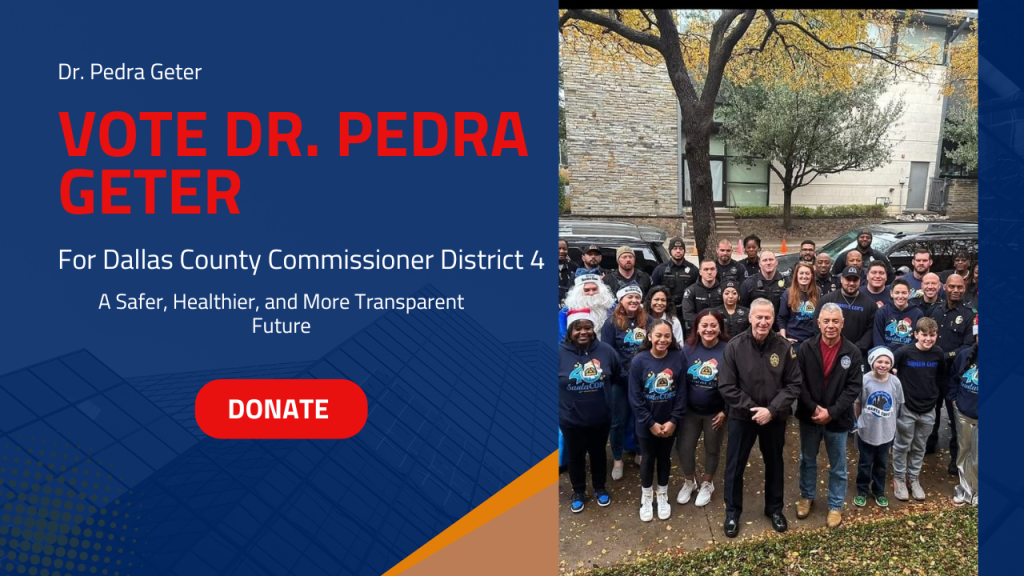 As a dedicated public servant and lifelong advocate for community well-being, Pedra Geter is running to ensure Dallas County works for everyone — no matter your background or political affiliation. Her platform centers on commonsense solutions that reflect our shared values: safety, accountability, and access to quality care.